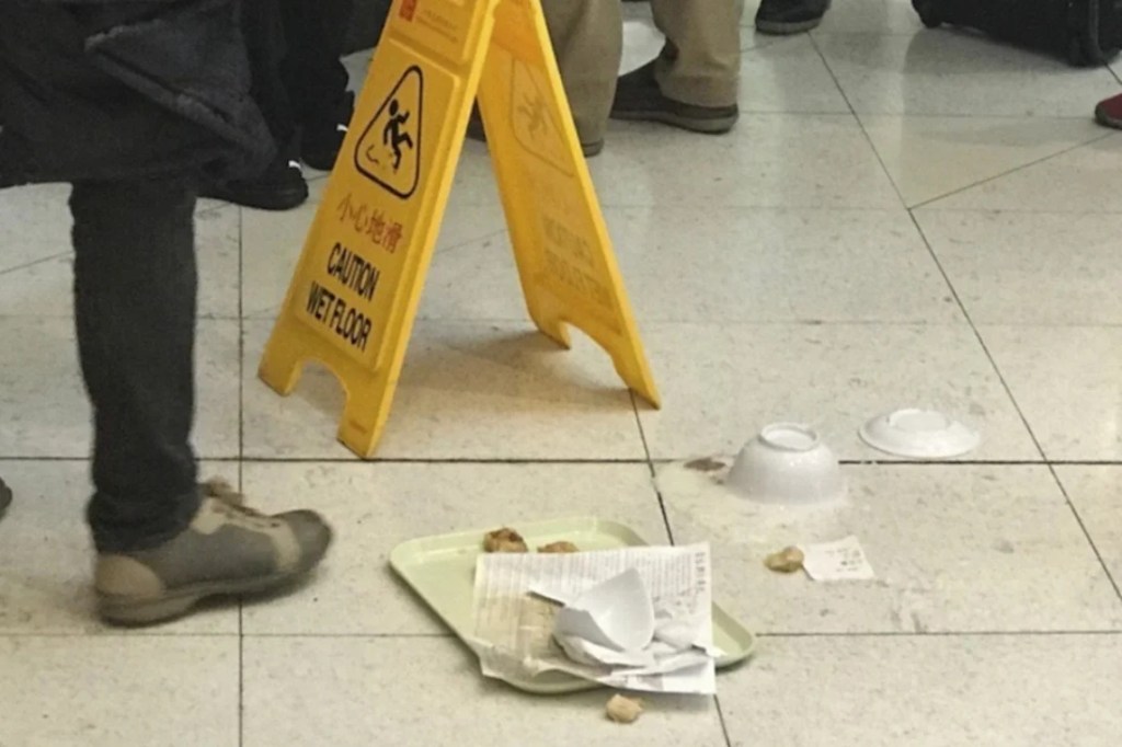 At the café, waiting for their homebound flight, they got into a scuffle with a member of staff. They complained about poor customer service. He told them to stuff it and swore at them. Both sides, according to one witness, started throwing food around, until the man pushed a tray of congee and noodles at them, splashing some on one of the women’s clothes.