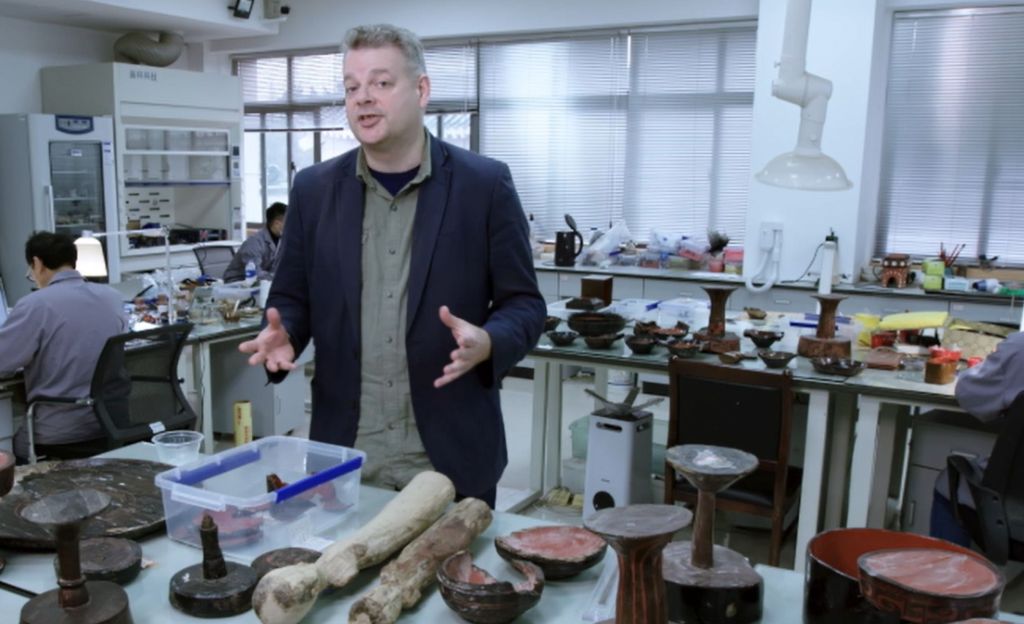 They don’t just do lacquer. They also do silk, bamboo and wood, but we’re here to talk about lacquer because that will somehow be the capstone to a storyline that I have yet to film. The institute’s director, chemistry graduate Mr Feng, is oddly cagey about being interviewed, but after lunch suddenly announces that he is ready. He chats to me about Vindolandia, the place on Hadrian’s Wall where archaeologists unearthed letters from Roman soldiers, thanking their mums for sending them warm socks, and talks me through the process of preserving ancient artefacts. The basement of the institute is a shallow swimming pool, used to keep precious items away from oxygen until they are ready to be fixed and dried.