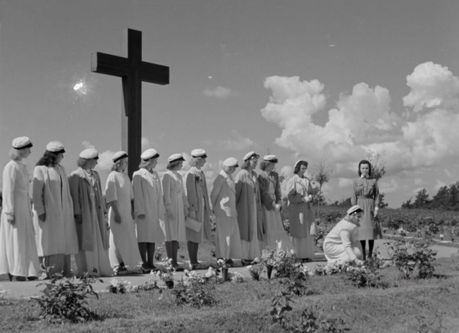 In the summer of 1941, Finland is in the midst of its Continuation War with the Soviet Union, and girls at a Helsinki college are laying flowers at the graves of fallen classmates. Maija (Mervi Järventaus) is clad in the distinctive grey uniform of the Lotta paramilitary auxiliaries, and tries to encourage the students to join up. Instead, she is veritably snarked at by Elli (Ansa Ikonen), an entitled rich girl who only has time for parties and fun.